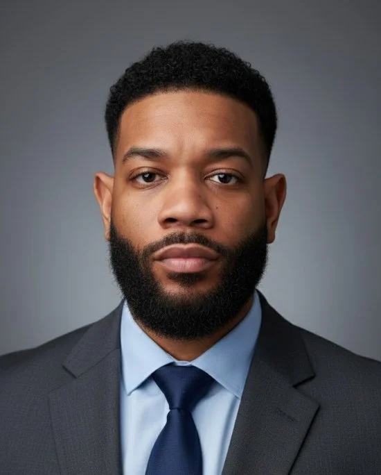 • Professional portrait of a young man in a black suit, white shirt, and blue tie, smiling against a gradient blue background.
